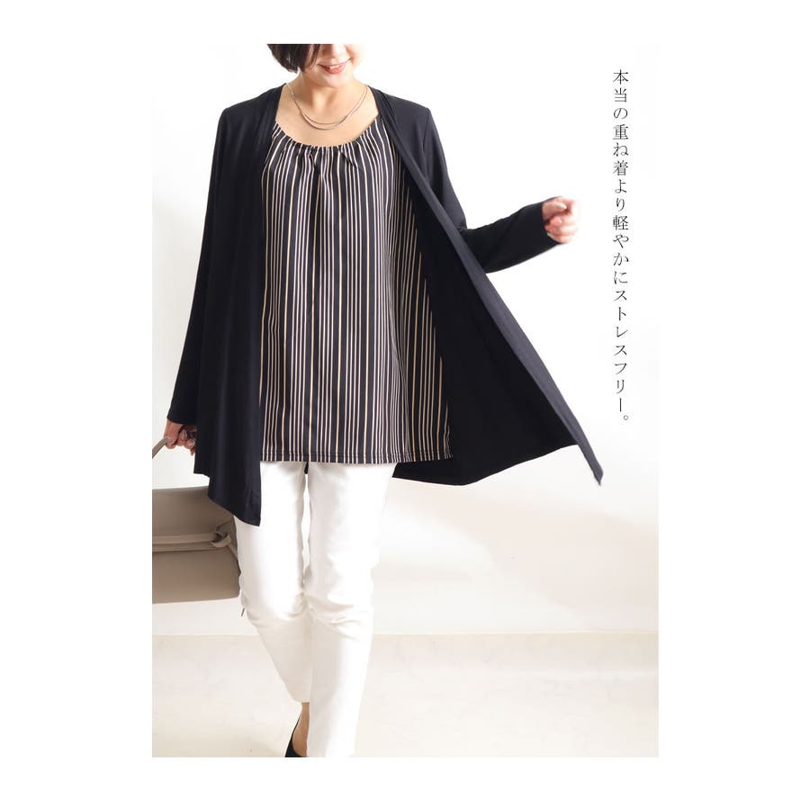 ニットカーディガンとストライプブラウスのドッキングトップスです。