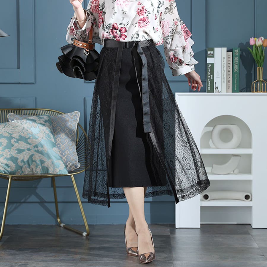 タイトスカートとラップレーススカートが重なりモード感漂う個性的な印象のスカートの登場です。