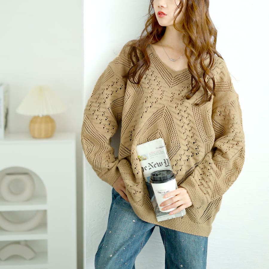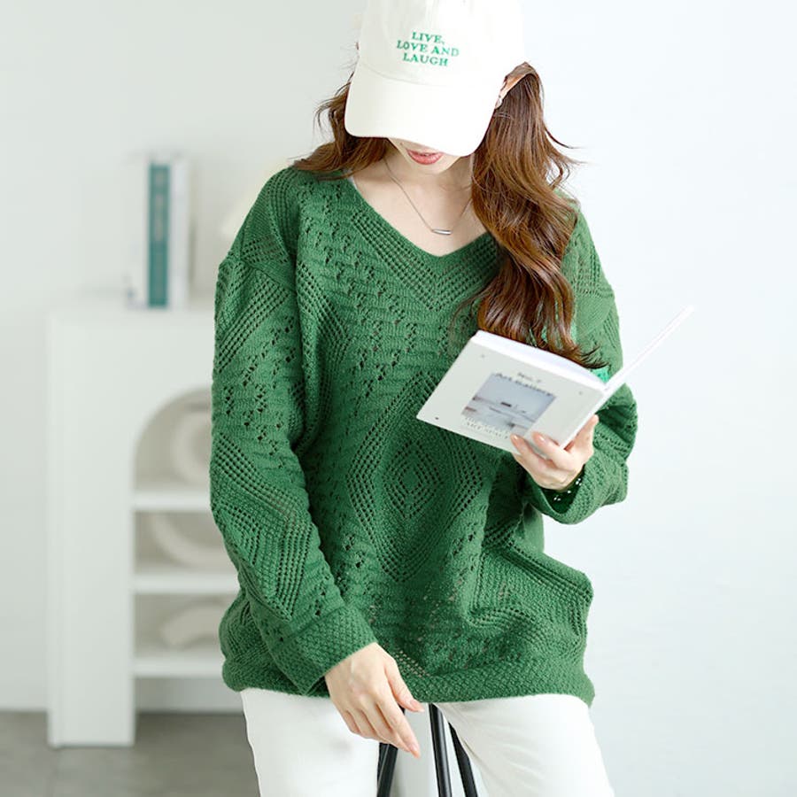 程よいゆったりシルエットがおしゃれな透かし編みニットです。