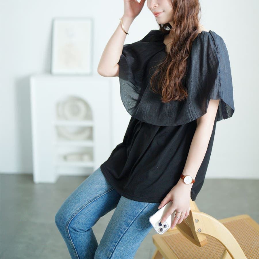 タンクトップにふんわりと重ねたケープ風レイヤーデザインのおしゃれトップスです。