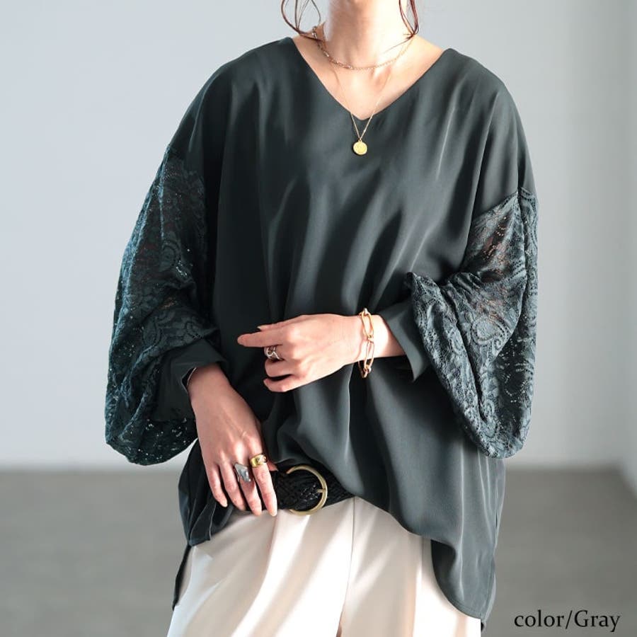 シンプルなプルオーバーに映えるレース袖、さり気ない肌見せが女性らしさを高めボリュームスリーブなのでふんわりと何気ない仕草まで美しく演出します。