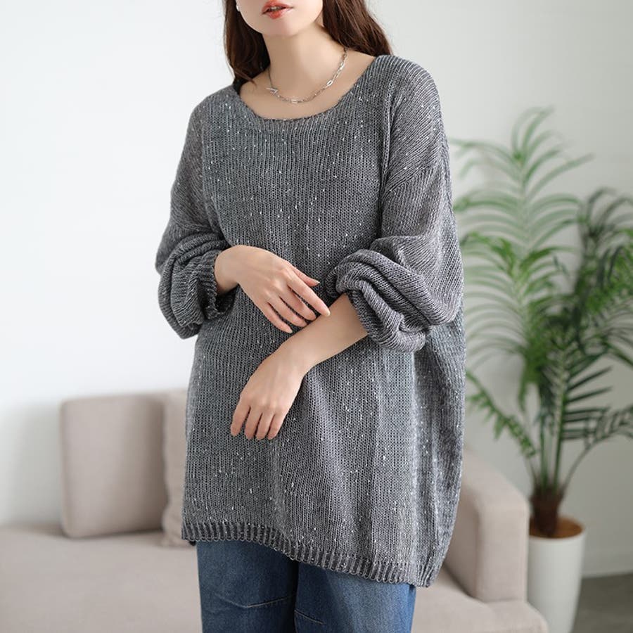 落ち着いたグレーに、光の加減でキラキラと輝く微細なラメが織り込まれ、ホワイトカラーのネック糸が重なり、シンプルながらも表情豊かな一枚。ほんのり透け感のあるローゲージニットでヘルシーな肌見せが、大人世代にもぴったり。