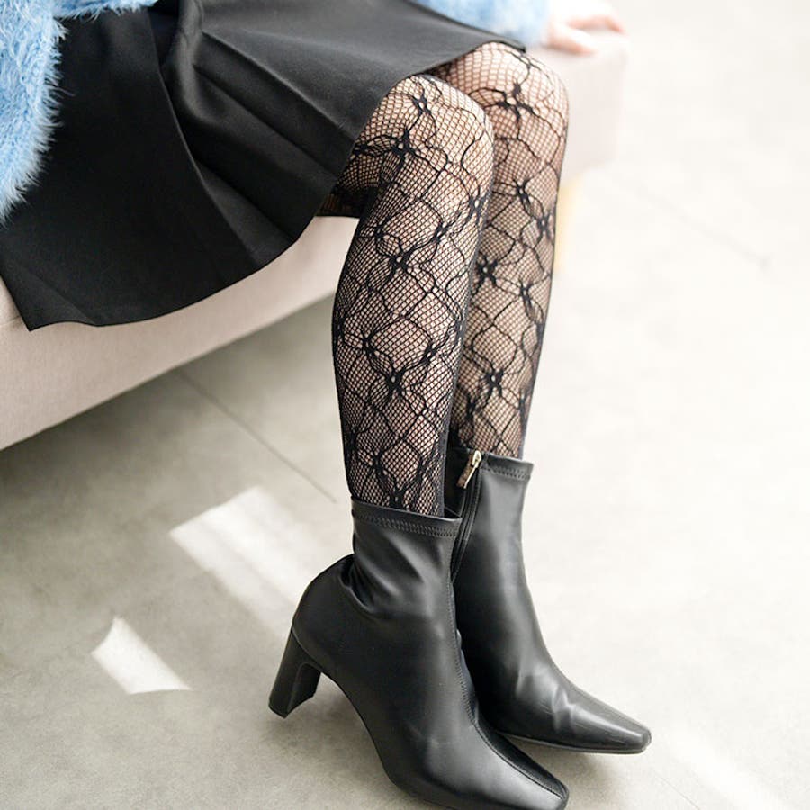 いつものコーデにプラスするだけで印象を引き締めてくれる、花柄の網タイツ。