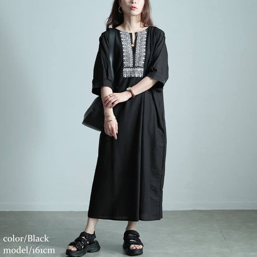 胸元の刺繍が目を惹く、インド綿のワンピース。
