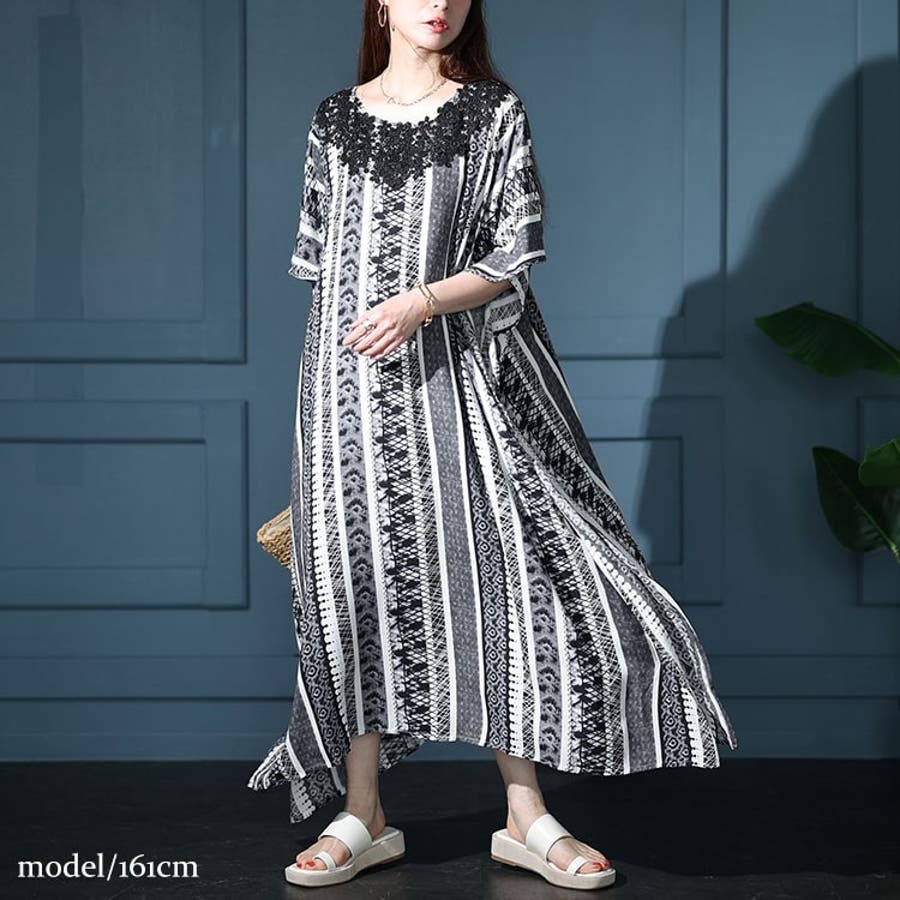 大きいサイズレディース ワンピース 胸元レースエスニック柄ドルマンワンピース