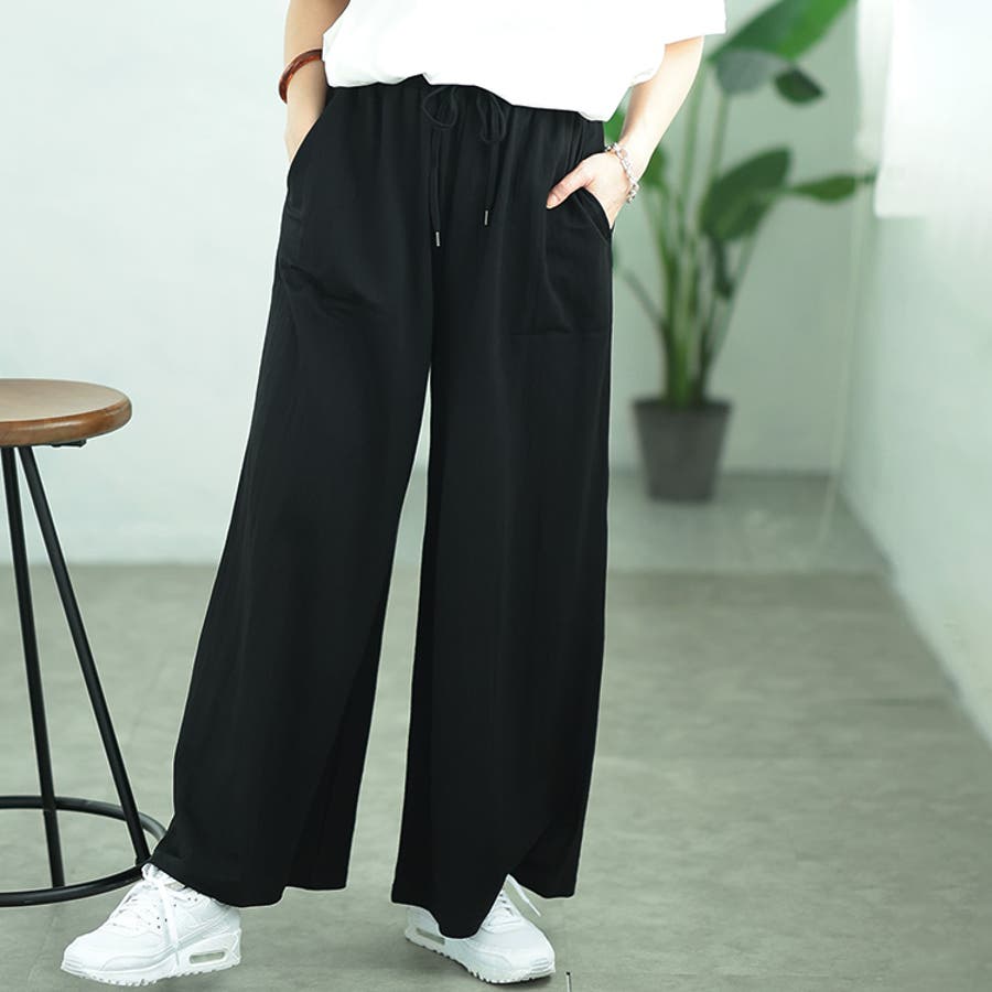 ワイド幅のパンツはハンサムな印象が漂い、落ち感のある生地でラフさをプラス。ウエストゴムとドロスト仕様でストレスフリーな着用感が持続し、フルレングス丈は大人っぽさと上品さを演出し、下半身を丸ごと体型カバーします。