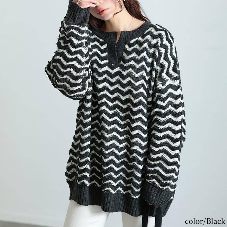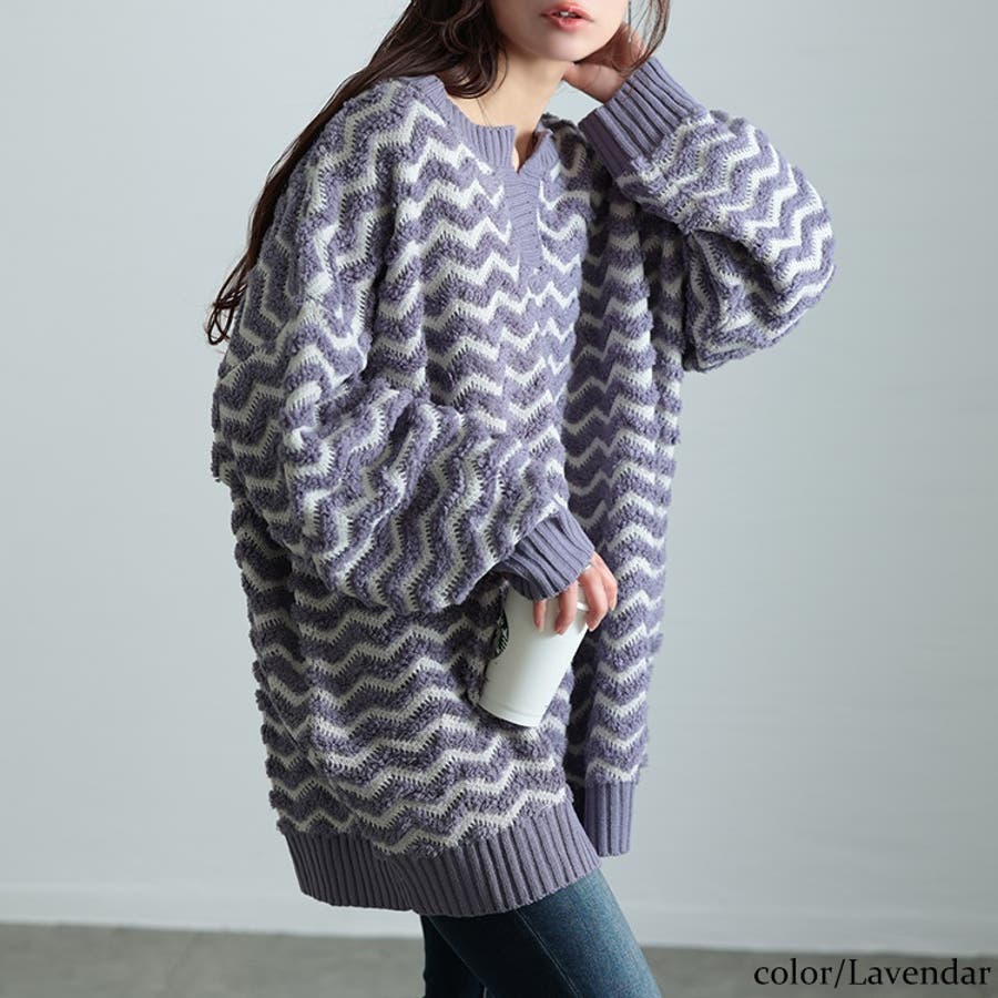 立体感のあるリズミカルなシェブロンボーダーが風合いある着こなしに。キーネックの首元で大人っぽさが漂い、お顔周りをすっきりさせ抜け感をプラス。ゆるっとした着こなしがトレンド的に。窮屈感なくレイヤードも楽しめるサイズ感です。