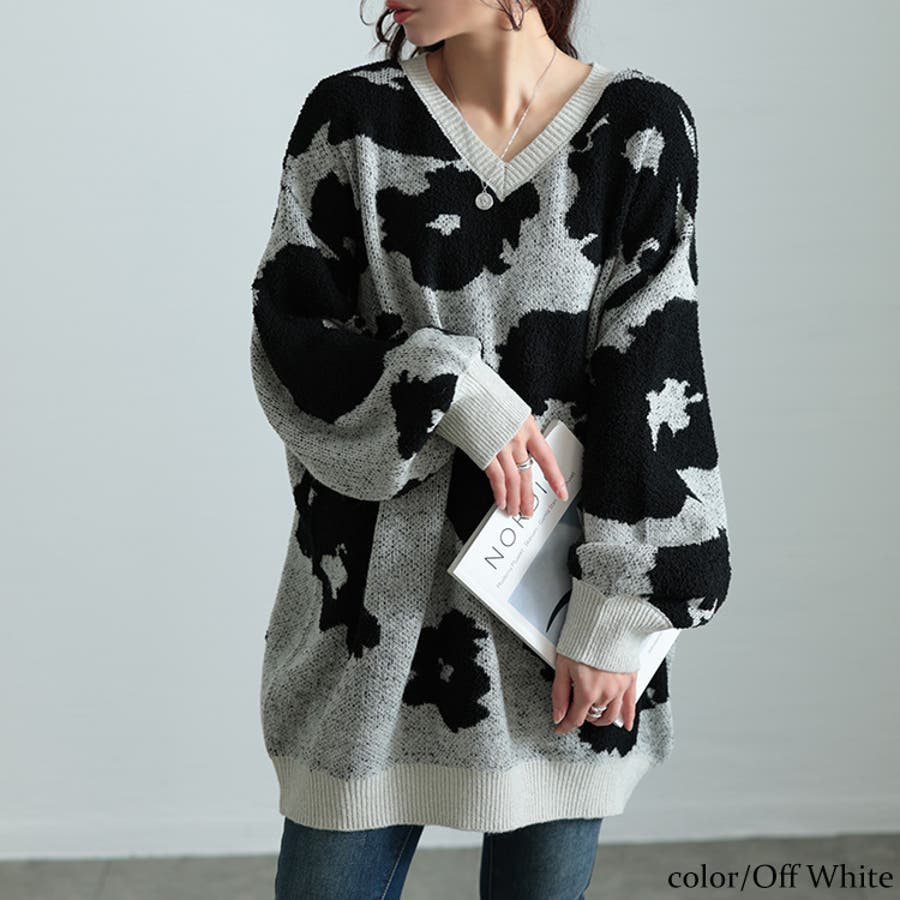 大人顔な着映え力とスタイルアップを狙う大判柄ニット。