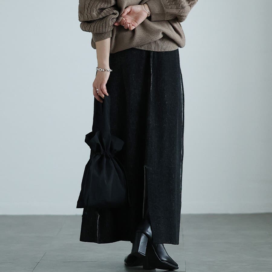 Iラインのシルエットは体型を拾うことなく、すっきりとしたラインに。後ろ側の裾には深めのスリットで、足下の抜け感をプラスしながら足さばきも快適。裏地の配色がちらりと覗き、小粋な洒落感を感じさせてくれます。