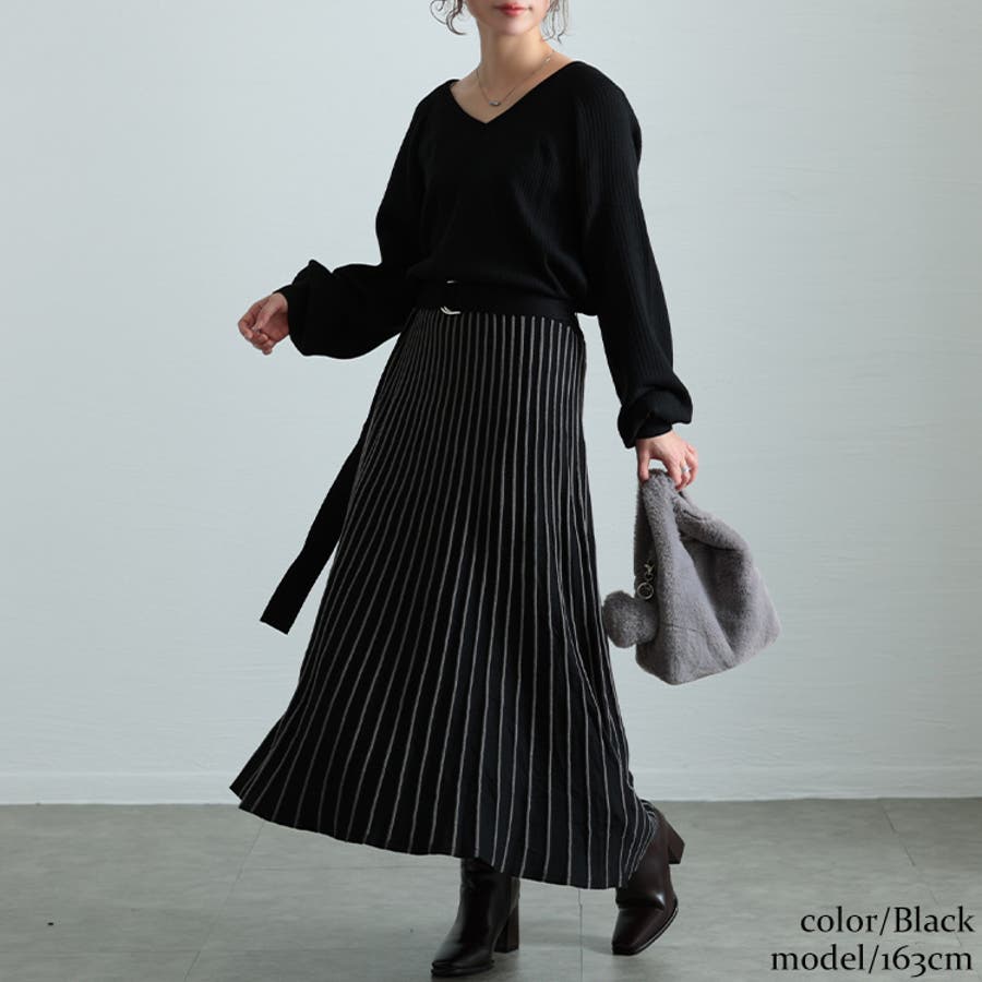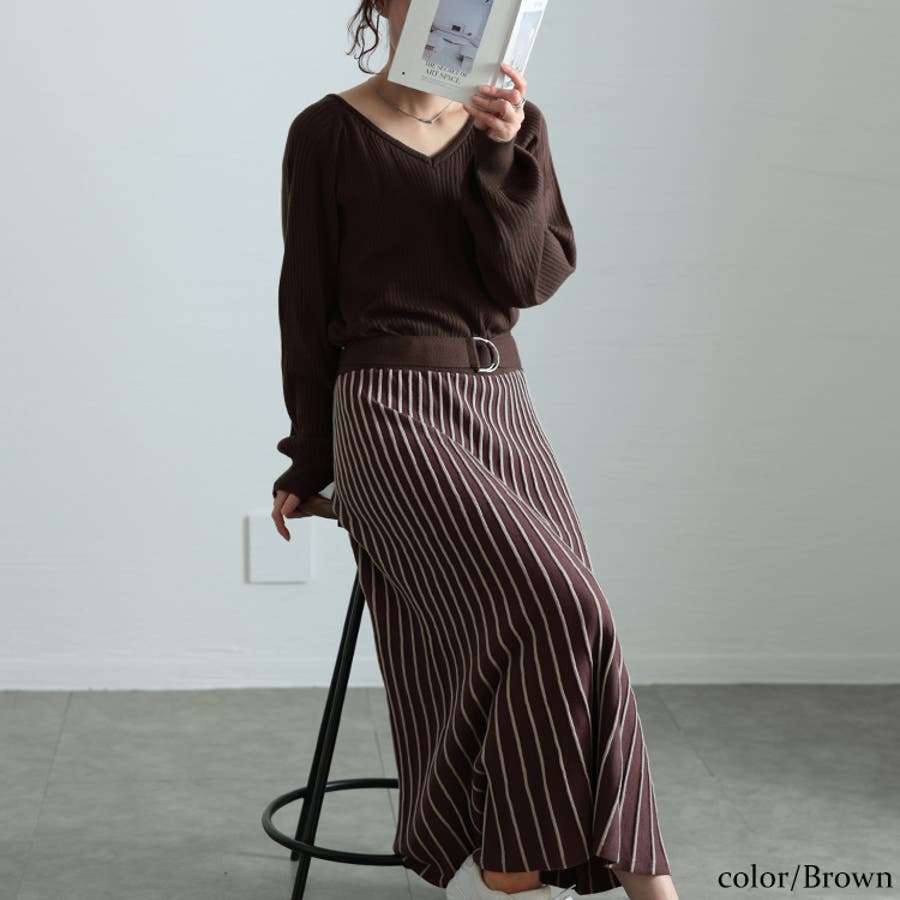 配色パイピングのニットがストライプ柄を描き、縦ラインを強調しながらスタイルアップに。ベルト付きだから、ウエストマークし、メリハリあるシルエットへ。広がり過ぎない品のあるフレアスカートが大人っぽさを加速させます。