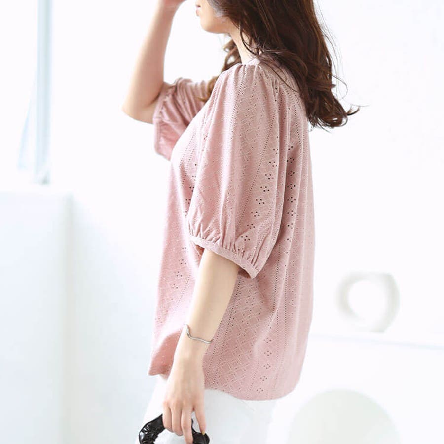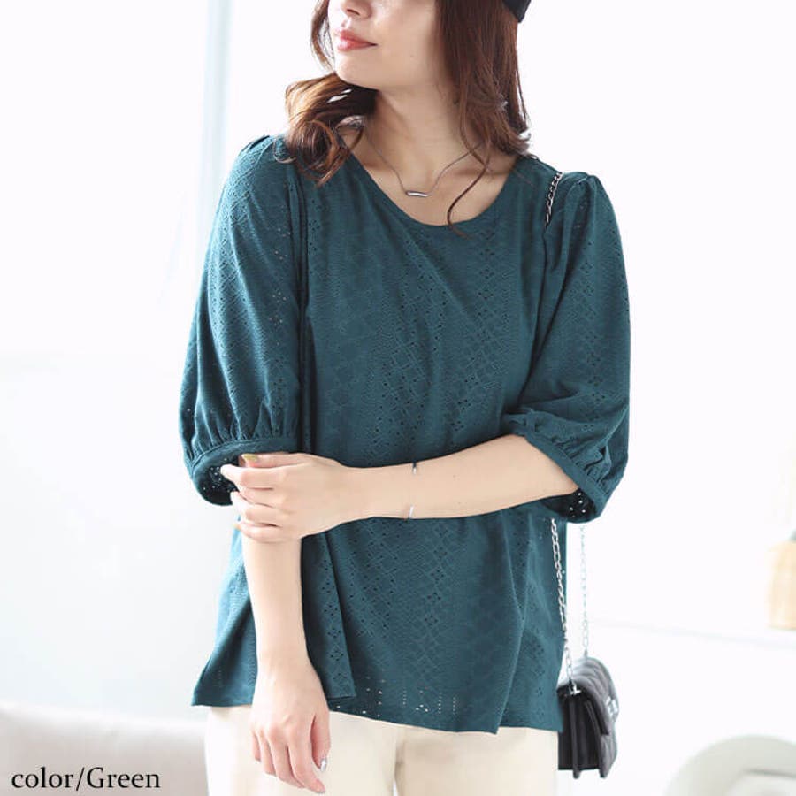 パフスリーブで二の腕もきれいにカバーして、程よい透け感で女性らしさもプラスしてくれます。