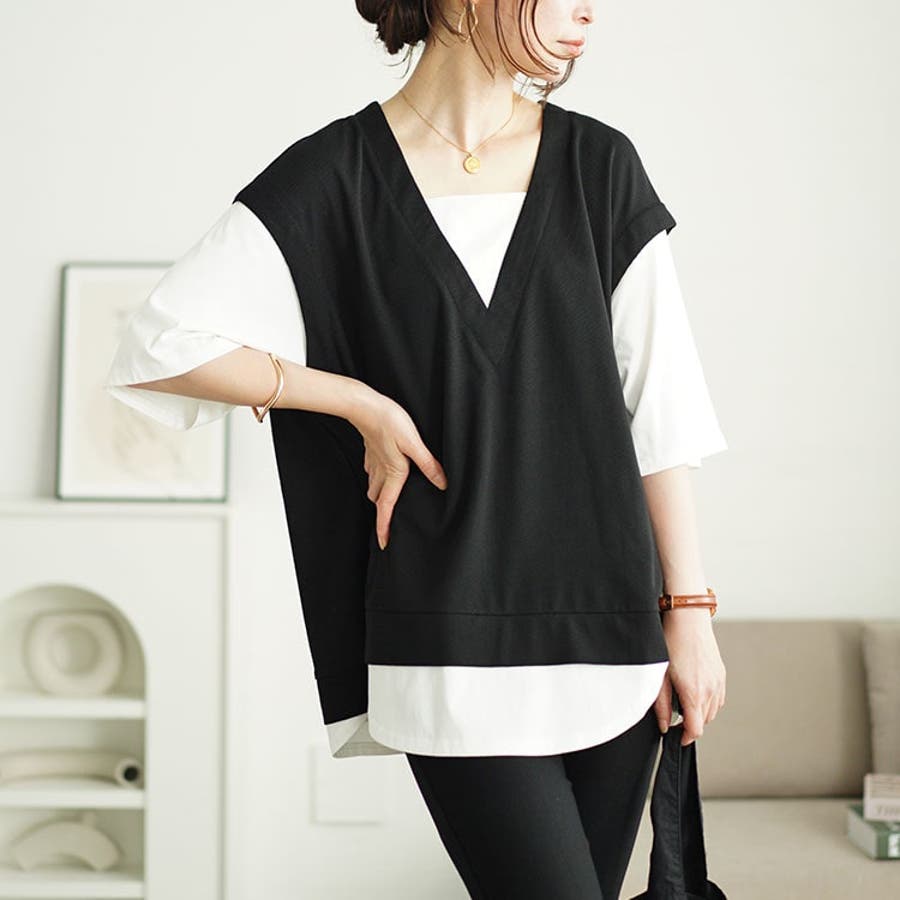 深めのVネックベストをレイヤードしたデザインでスッキリした印象に☆