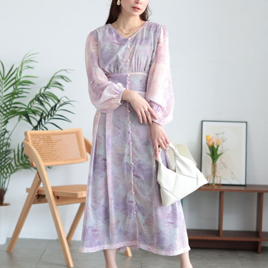 ニュアンス柄ウエスト切り替えシフォンワンピース