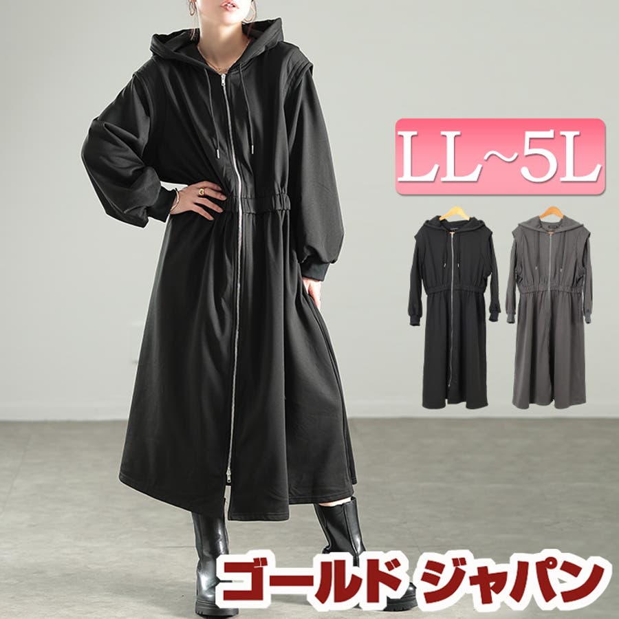 大きいサイズレディース ワンピース ウエストギャザーZIPパーカーワンピース