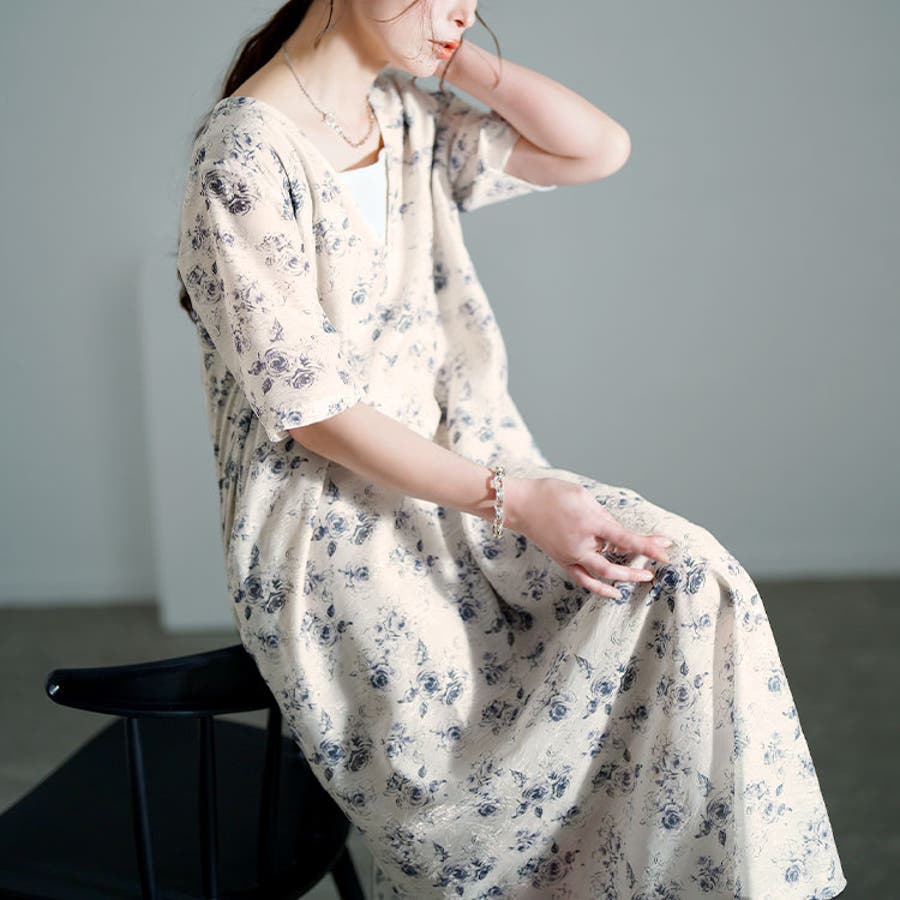 花柄シフォンジャガード深Vネックワンピース