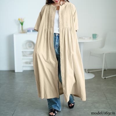 ゆったりとしたサイズ感で体をすっぽり包み込む安心感がありながら、ギャザー切り替えで縦ラインを強調し、すっきりとした印象をプラス。ギャザーが立体感をつくり、華奢見え効果にも。長めの丈感で大人っぽさを演出し、シンプルだからスタイリングを選ばないのも嬉しいポイント。