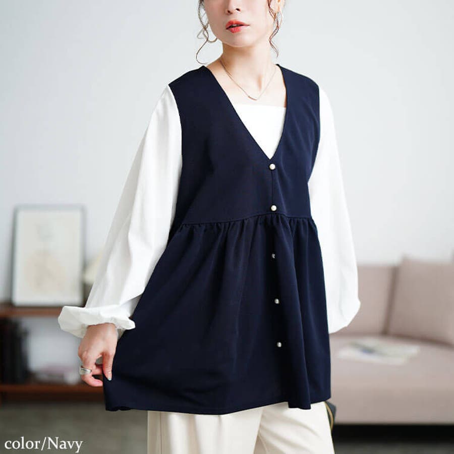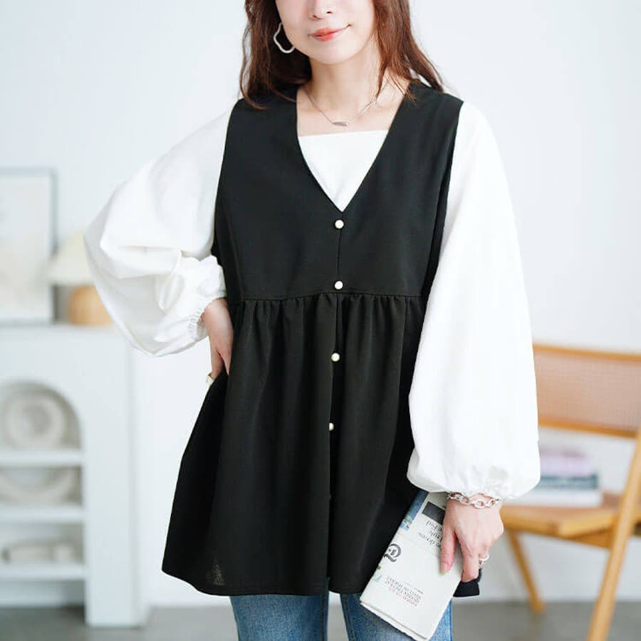 ボリュームスリーブブラウスとペブラムベストをコーデしたような重ね着風デザインで一枚でコーデ完成!