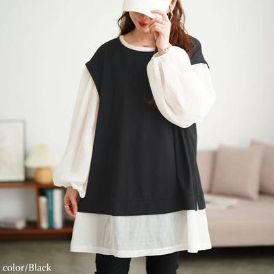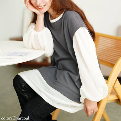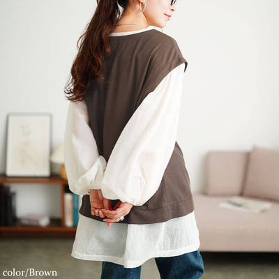 ボリュームスリーブブラウスとワッフルベストをコーデしたような重ね着風デザイン♪