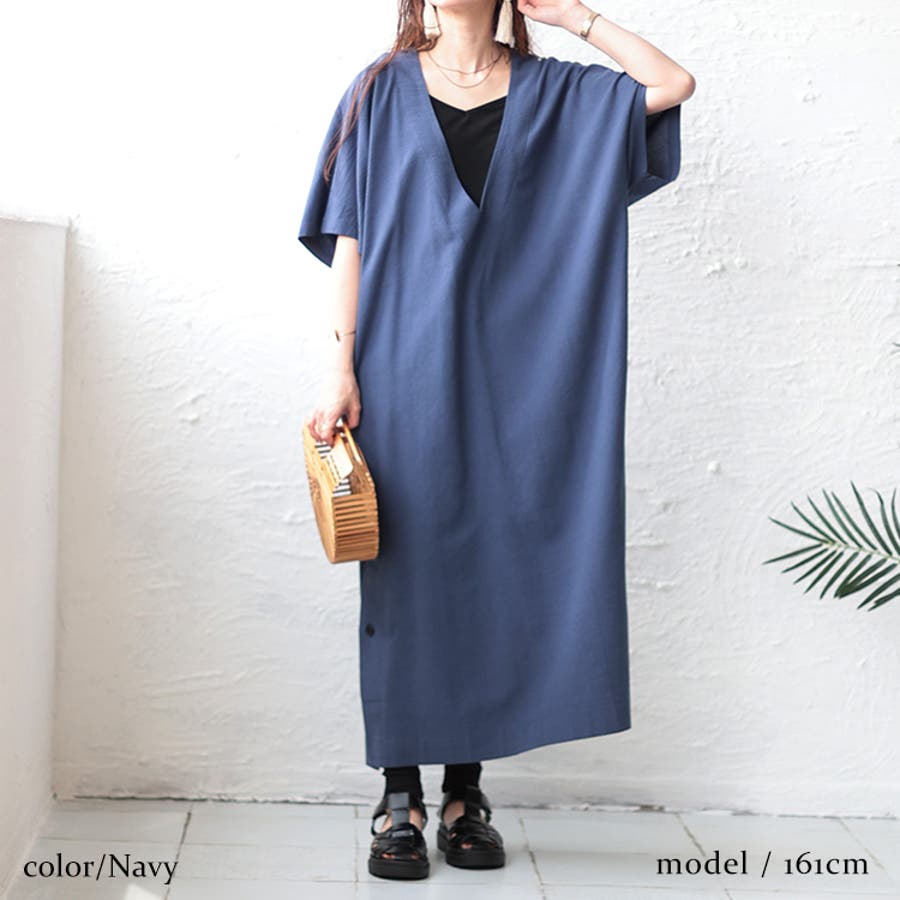 深Vネックスリット入りナチュラルワンピース