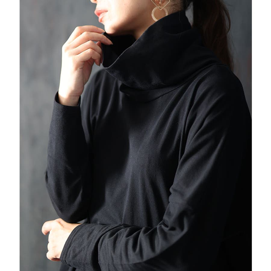 定番の綿カットソーに新デザインが登場です。ボタンで衿はゆったりと高めのオフハイネックになっていて立たせて少しだけくしゅっとさせて着るのが可愛い☆小顔効果も絶大です!