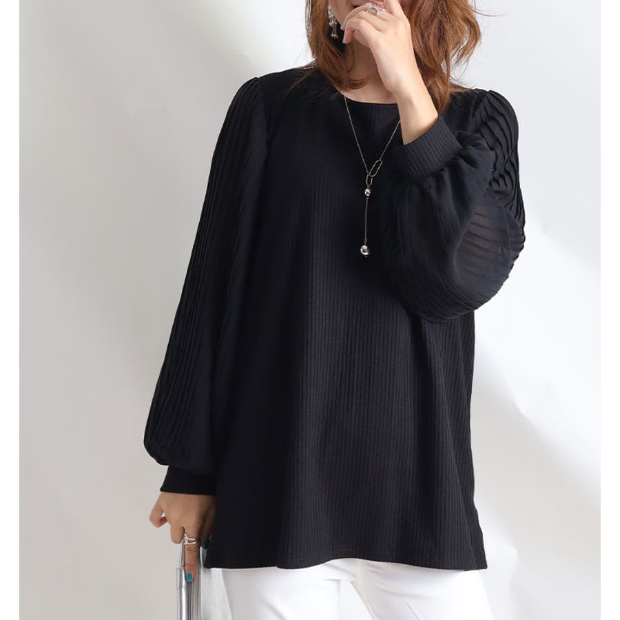 袖シフォンプリーツリブニットシャツ