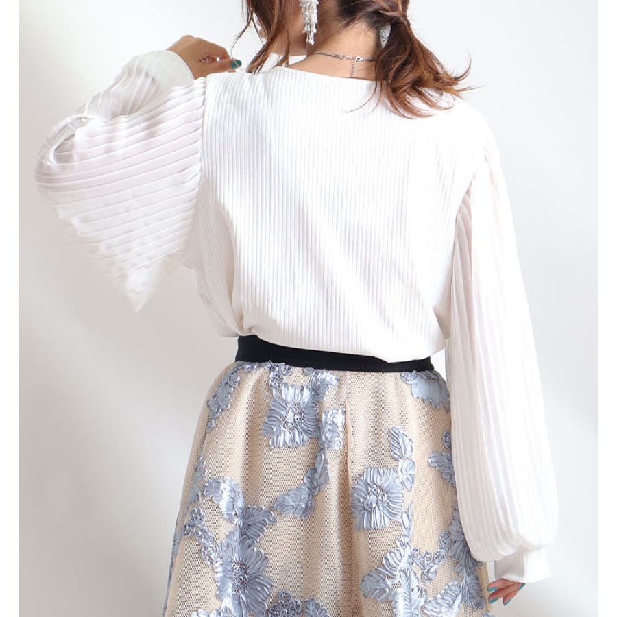 プリーツ加工のシフォン袖が、上品で高見えします。