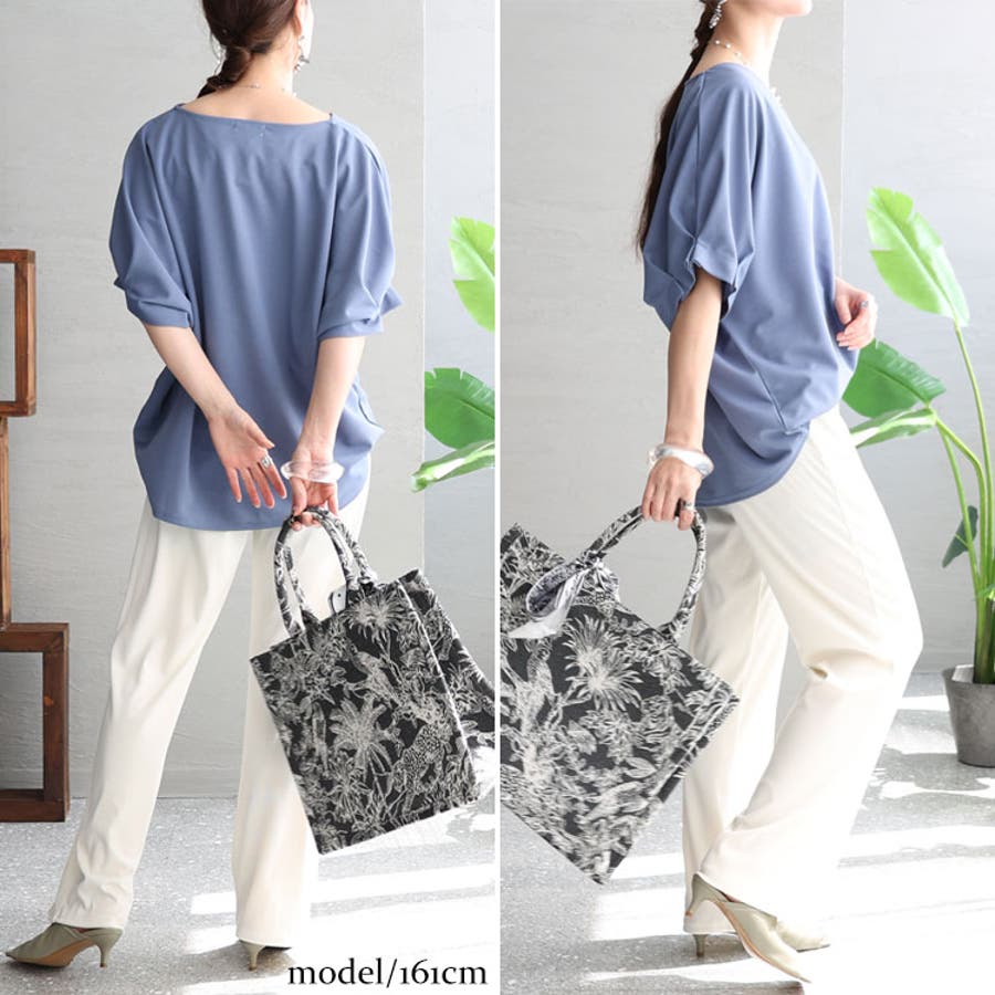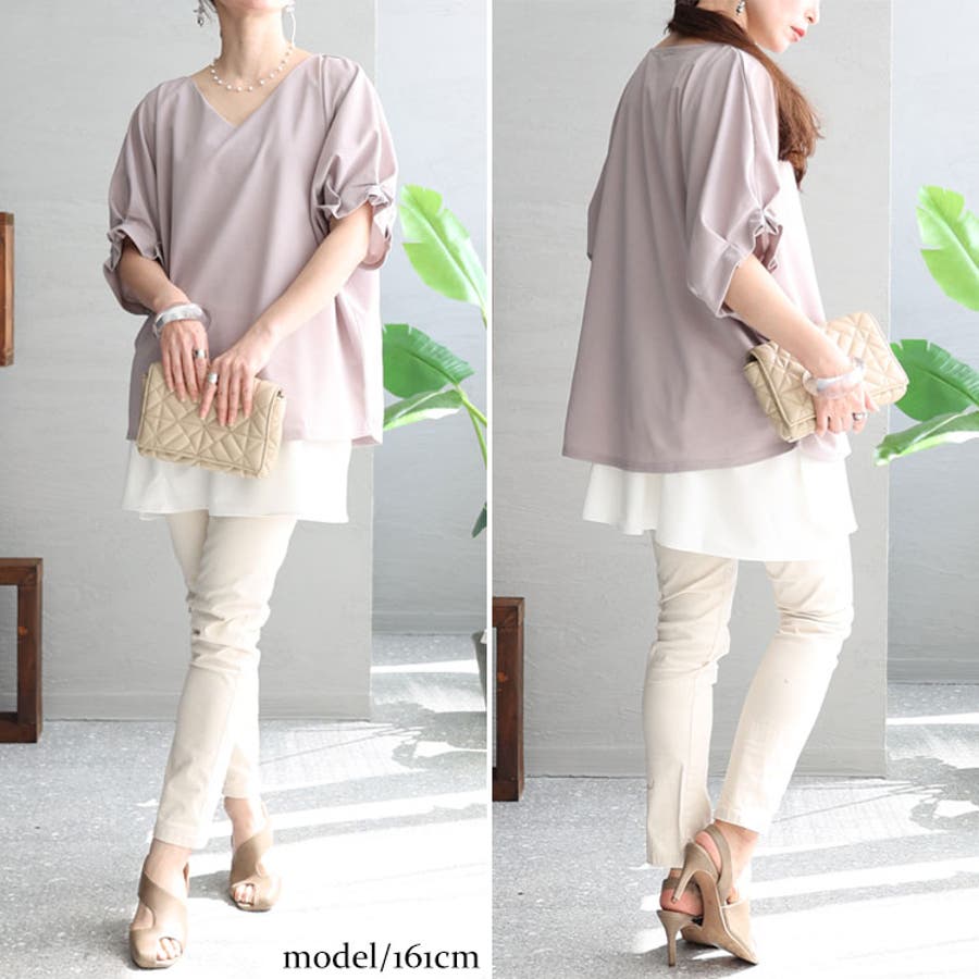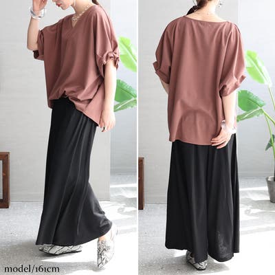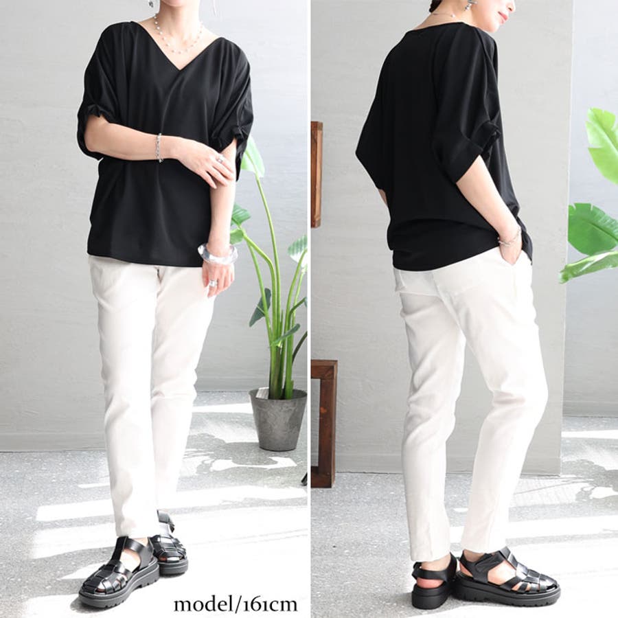 首元はVネックですっきりと身幅も余裕を持たせたデザインで楽な着心地です。