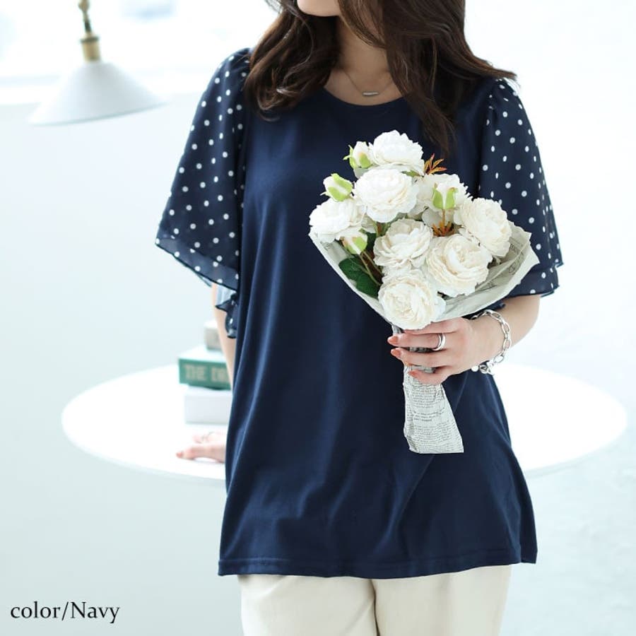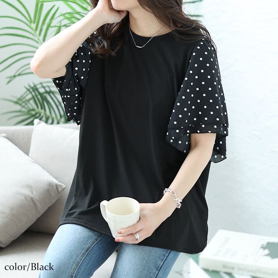 ドットプリントで重なったフリルのフレア袖がかわいらしさをプラス。