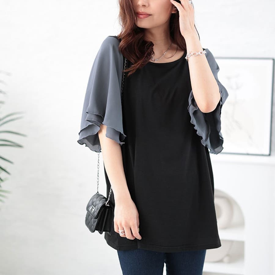 袖がほんのり透けており、ふんわり二の腕を隠してくれるフレアデザインがポイント◎