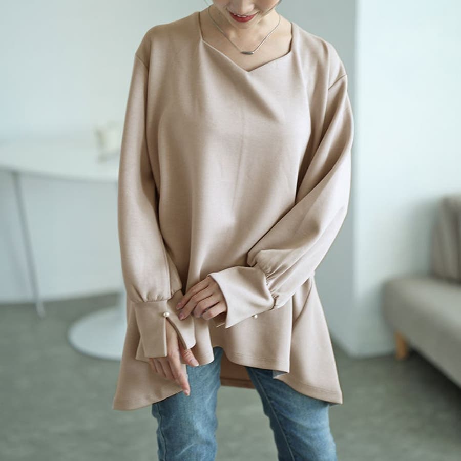 パールボタンハートネックペプラムカットソー