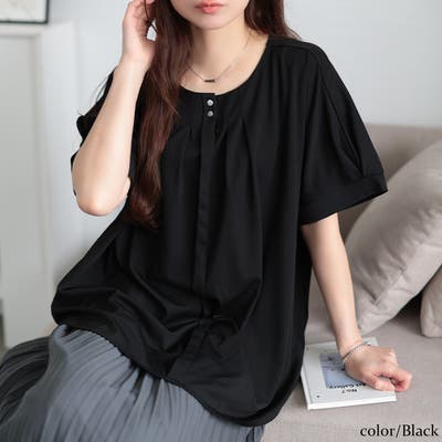 胸元や、袖口、背中にタックが仕込まれ、程よくふんわりとしたシルエットをつくりながら、見た目以上のゆったりとした着心地で、窮屈感なくしっかり体型カバー。首元にはボタン付きで着脱も楽々。ヒップも隠れて、インもアウトもサマ見えするブラウスです。