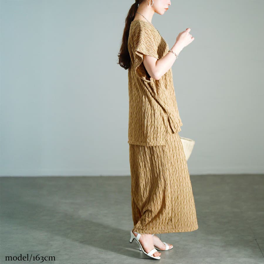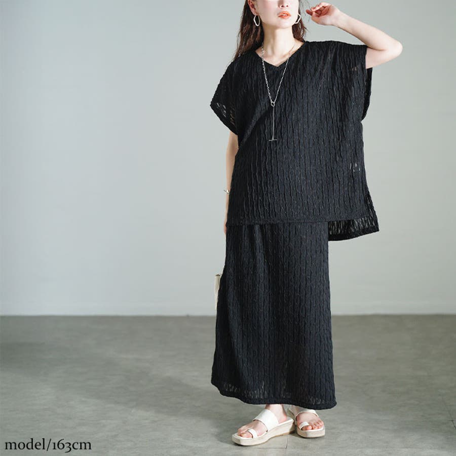 透け感と上品な柄が大人の魅力を引き立てる、トップスとナロースカートのセットアップです。
