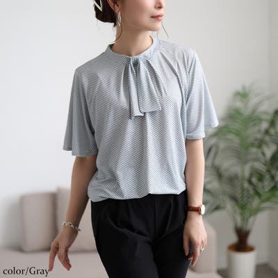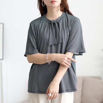 接触冷感ダイヤ柄ボウタイストレッチブラウス