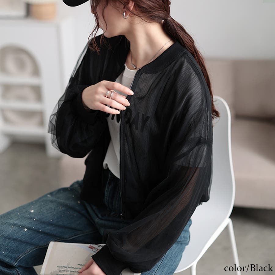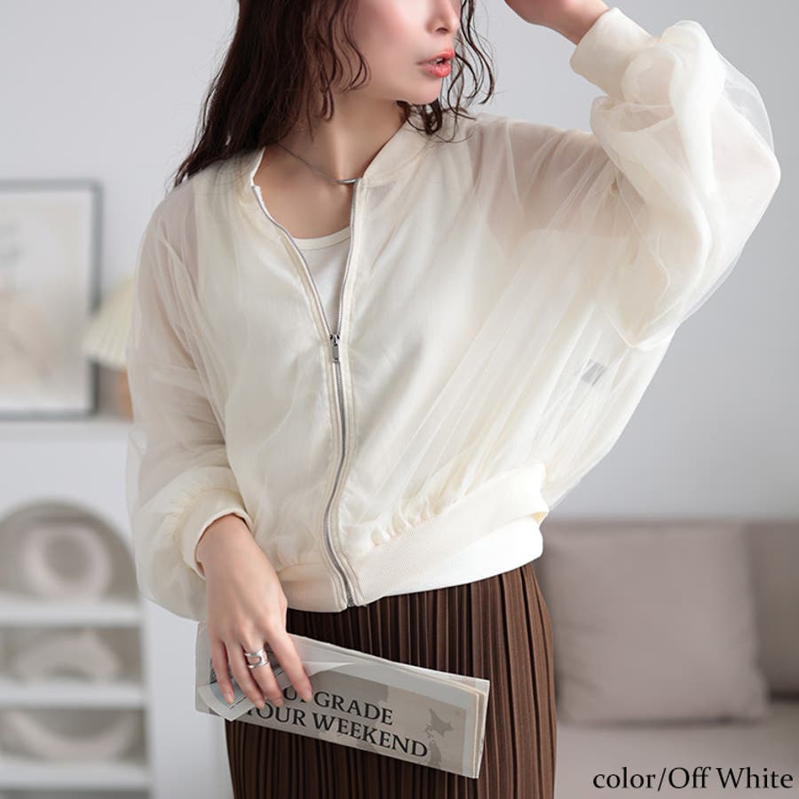 シアー素材で季節感を盛り上げるチュールショートブルゾン。チュール生地のシアー素材が軽快で爽やかな印象を纏い、女性らしさを演出します。スタジャンライクなシルエットとチュール生地で甘辛MIXなスタイリングに。ショート丈デザインで、全体をすっきりとさせ、ボトムスを選びません。