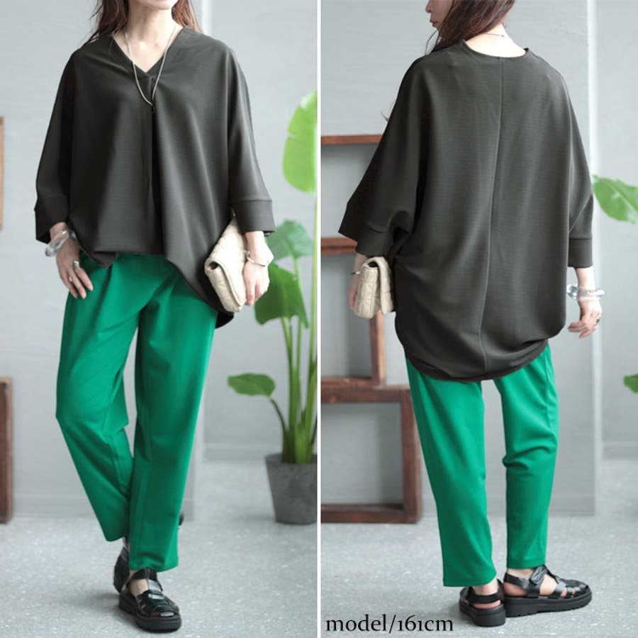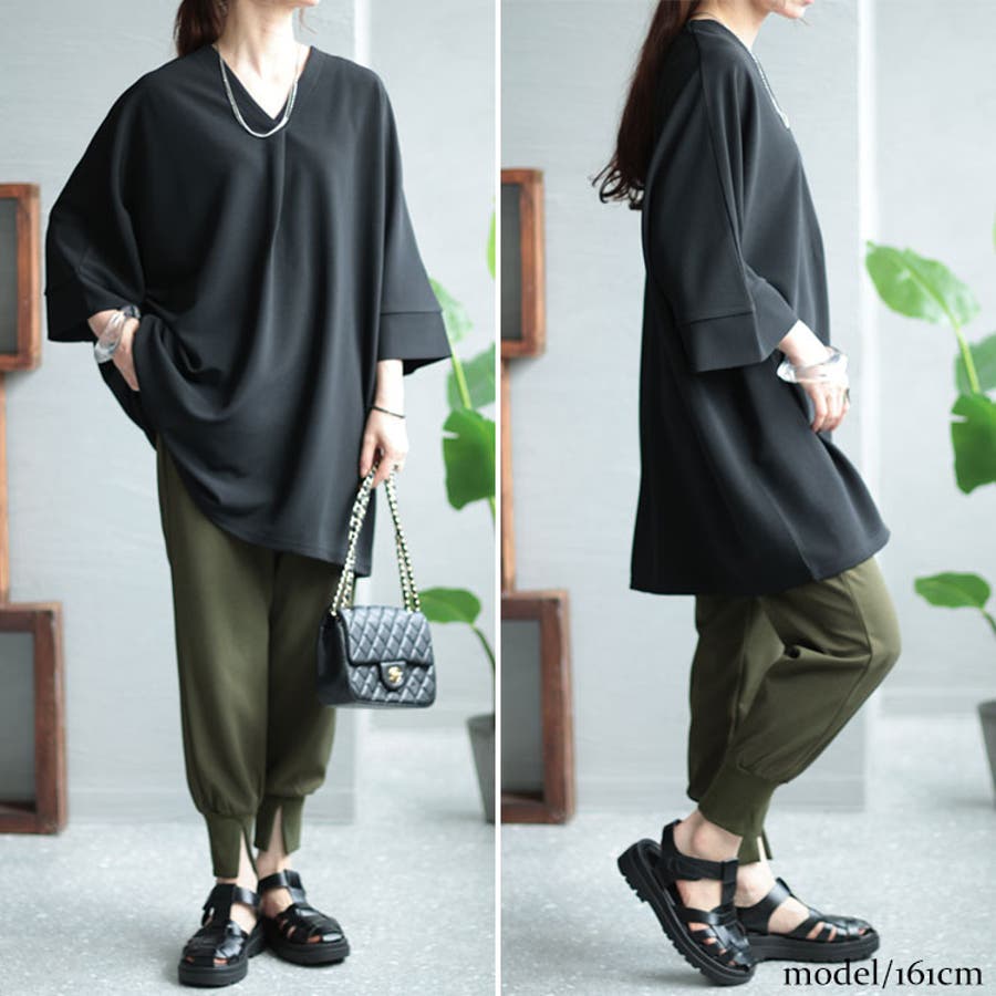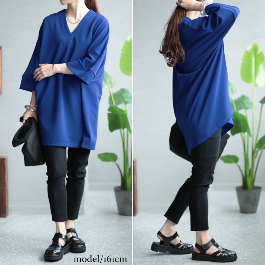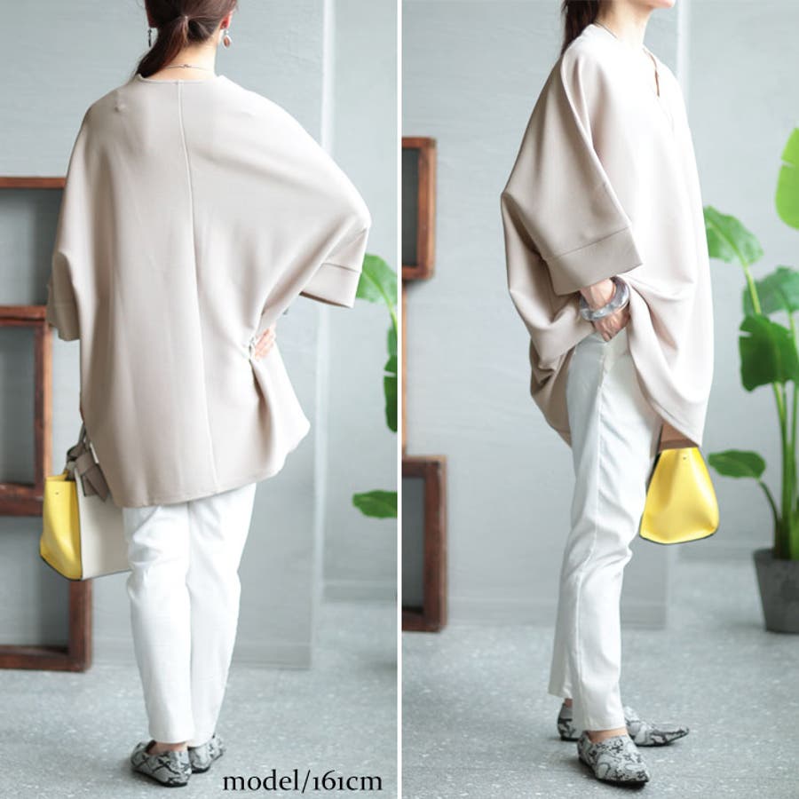 Vネックで首元すっきりとドルマンシルエットでノンストレスな着心地です。