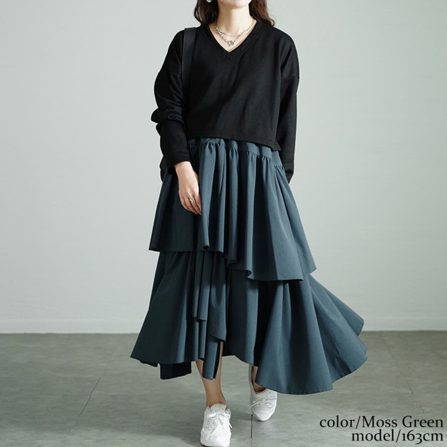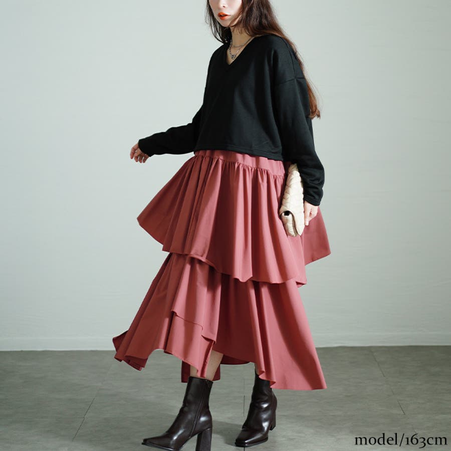 一枚で着映えるセットアップ風ティアードドッキングワンピースは、ランダムな丈感で表情あるティアードスカートが、ベーシックな黒のトップスに映えるレディな装い。