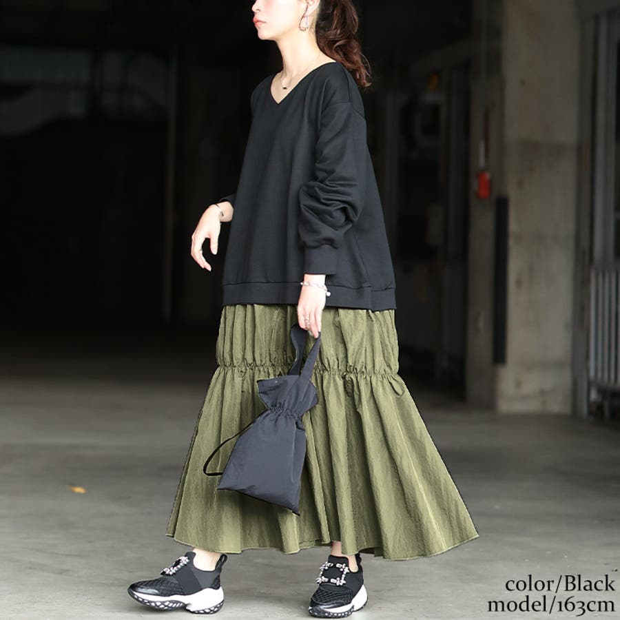 シャリ感のあるギャザースカートがふんわりと揺れ、シルエットに甘さをプラス。太ももあたりにギャザーを置くことで、膨らみ過ぎずメリハリを演出。フルレングス丈で上品さをアップし、脚長効果を促します。