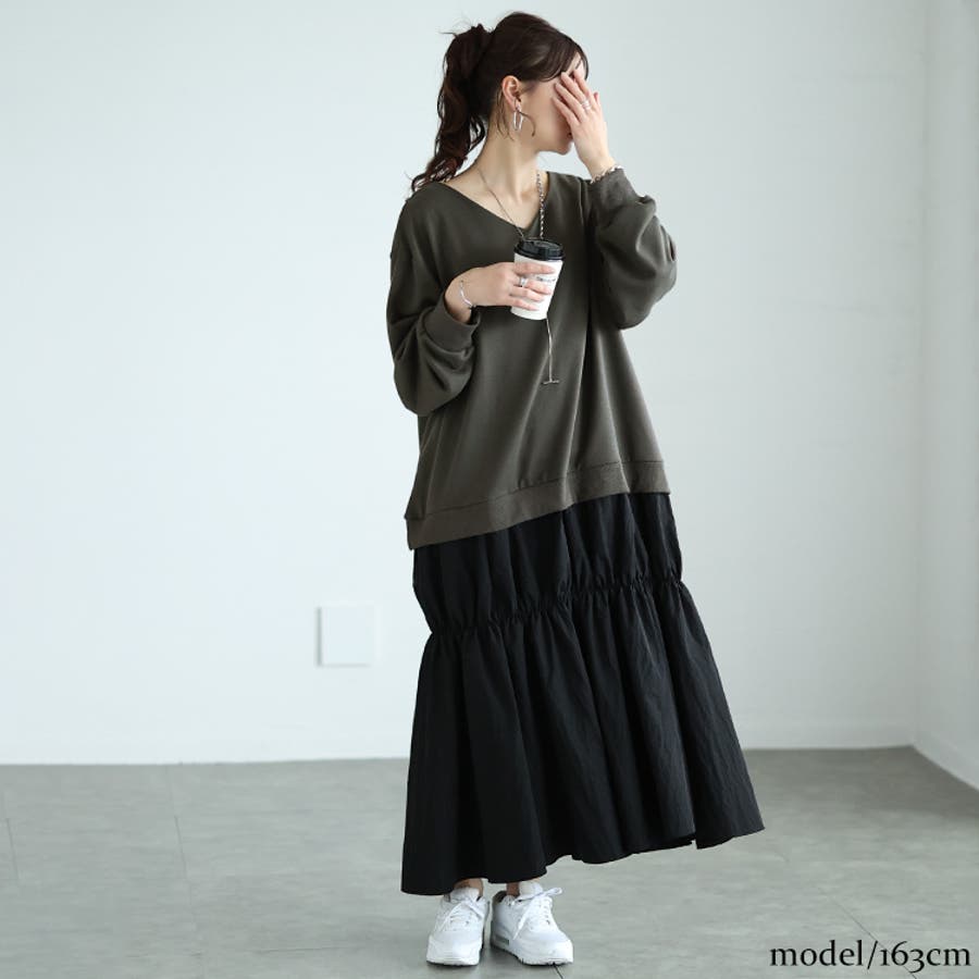 ワンツーコーデのようなドッキングデザインで、一枚でこなれるワンピース。Vネックの首元でお顔周りをすっきりさせ、大人っぽさを演出します。ゆったり身幅で体型を拾わず、リラクシーに体型カバーも狙える一枚。