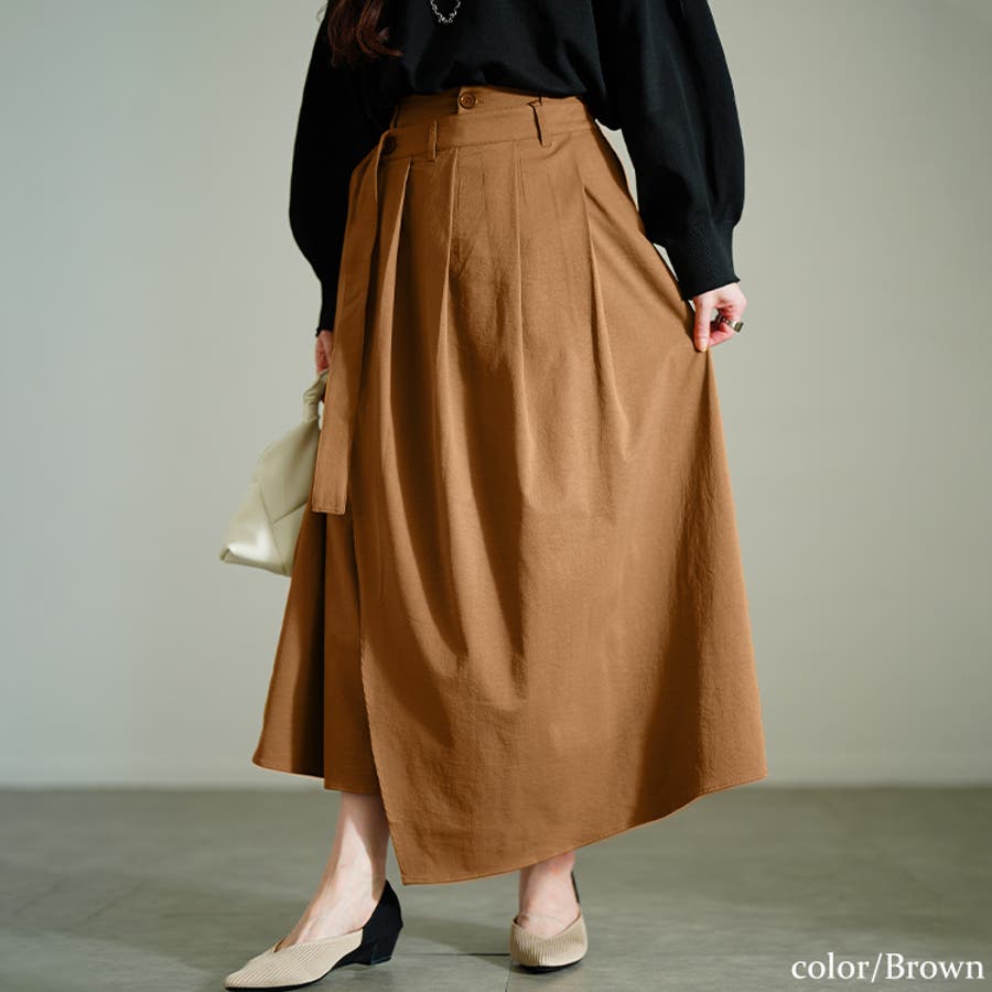 大人っぽさが宿るモードな佇まいなラップ風アシンメトリースカート。ラップ風デザインのスカートは、ウエストに段差をつけることで、動きのあるアシンメトリーなシルエットがモード感を演出する一枚。デザインの拘りが垣間見え、美しいAラインのシルエットで上品さを引き立てます。