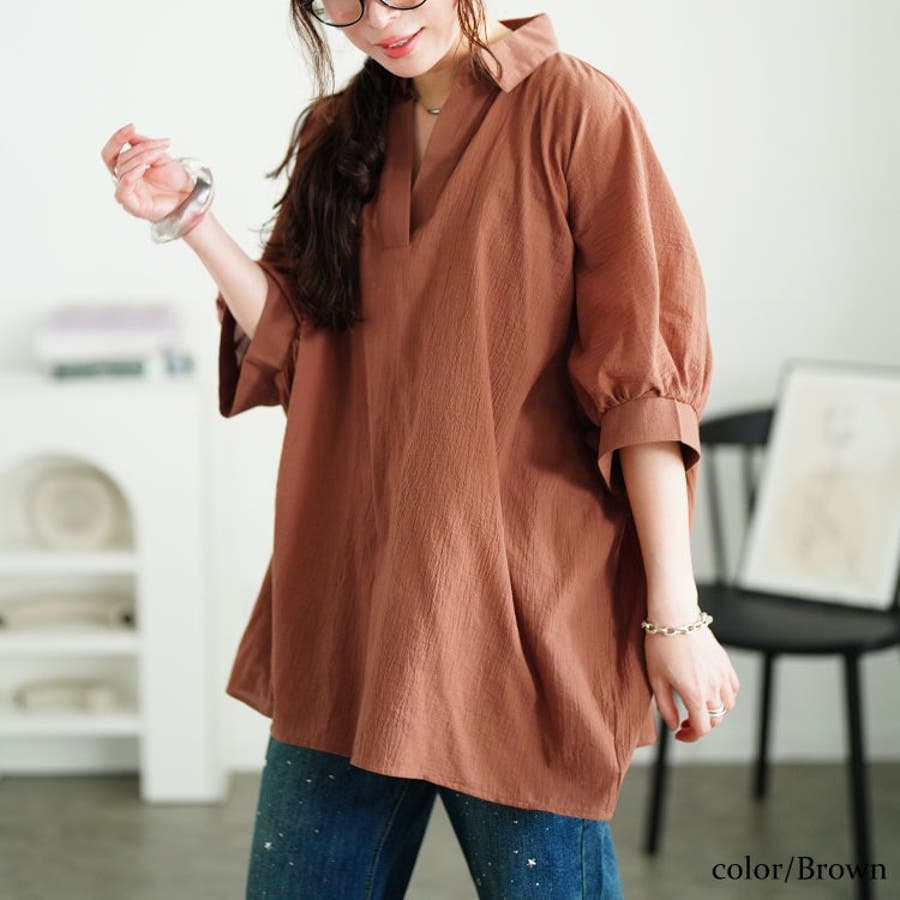 顔周りをスッキリ見せるスキッパーカラーが軽やかな抜け感を、