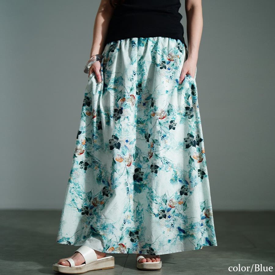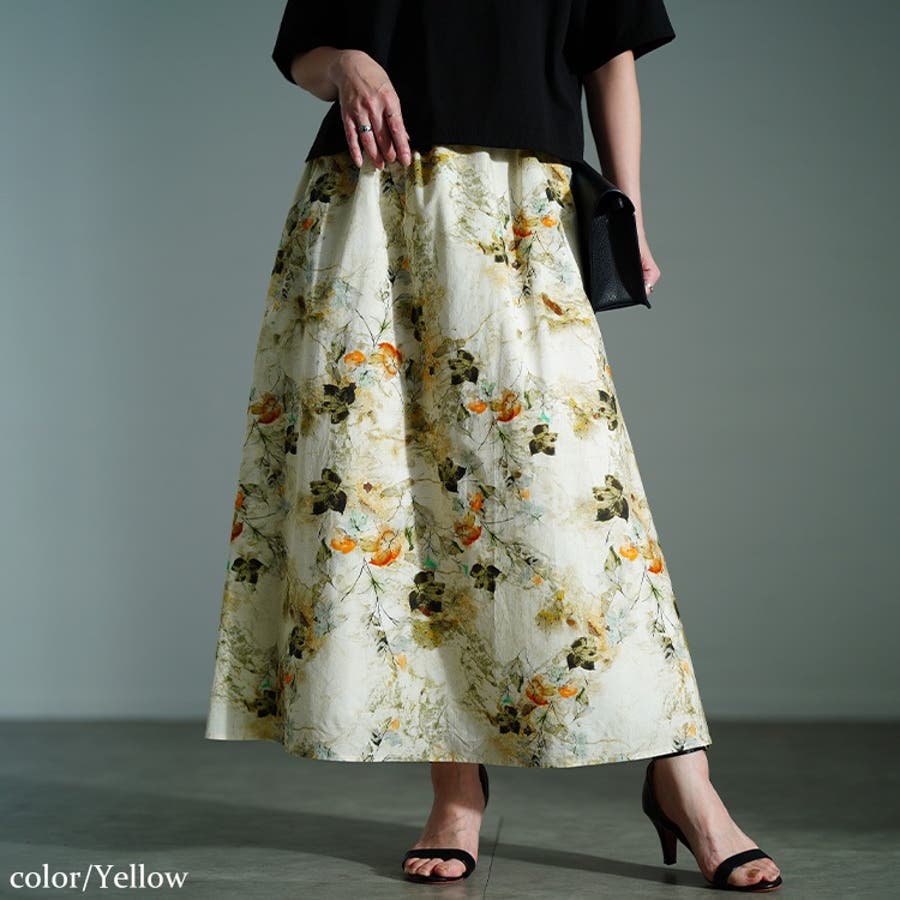 アーティスティックなボタニカル柄が描かれたスカートは、コーデに投入するだけで華やぎを増し、大人っぽさ引き立つ一枚。イエローは温もりを感じさせ、ブルーは爽やかさを演出し、それぞれのカラーで印象が変わり、色選びも楽しめる着映えるスカートです。