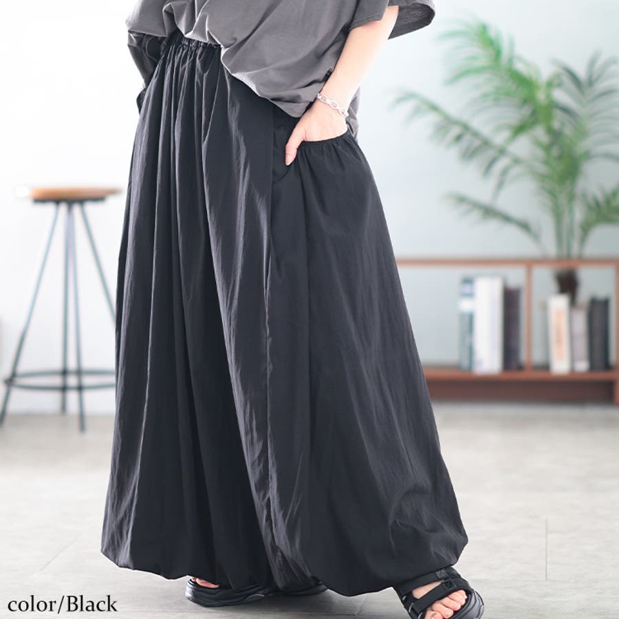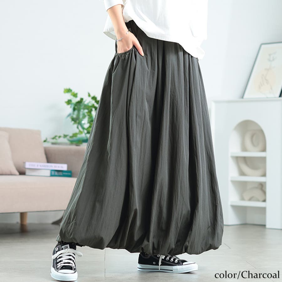ふんわりとしたシルエットで穿くだけで下半身をしっかりカバーしてくれる頼れるアイテム。ウエストにはギャザーゴムを採用し、長時間穿いてもリラクシーな着心地に。ウエストやポケットにたっぷりのギャザーを重ね、贅沢なボリューム感を演出します。