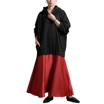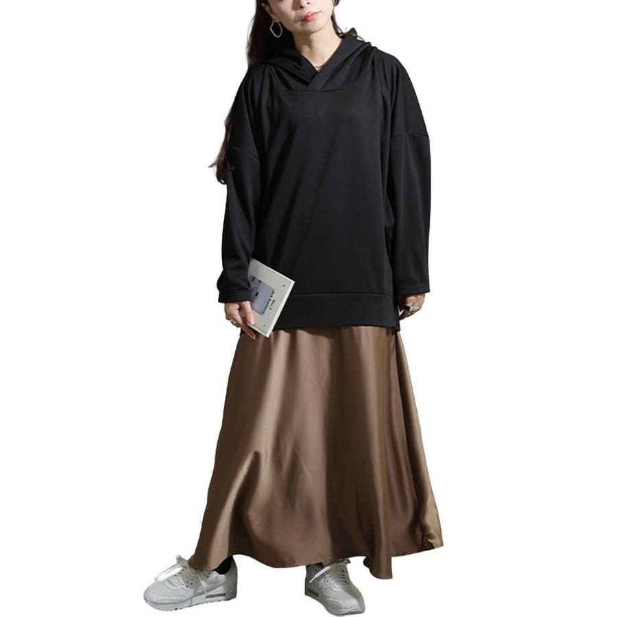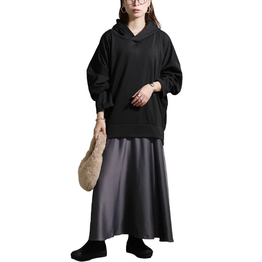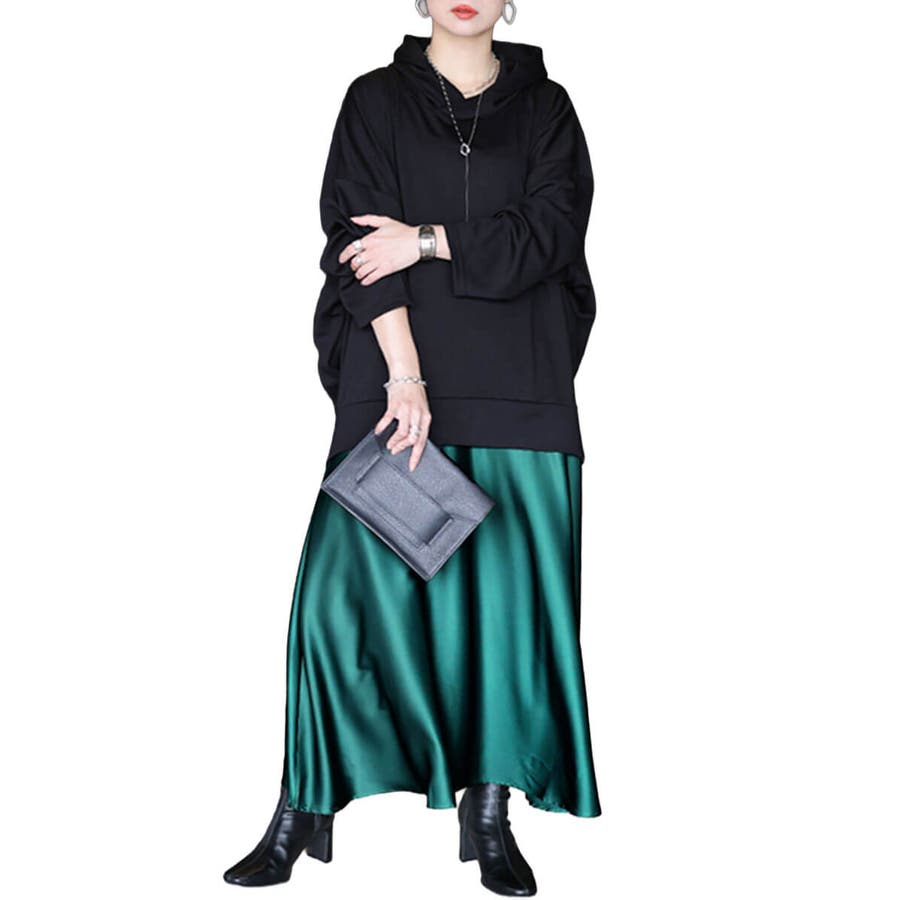 ゆったりパーカーと艶やかなサテンスカートをコーディネートしたような、カジュアル感がありながら女っぽさを忘れないデザイン☆