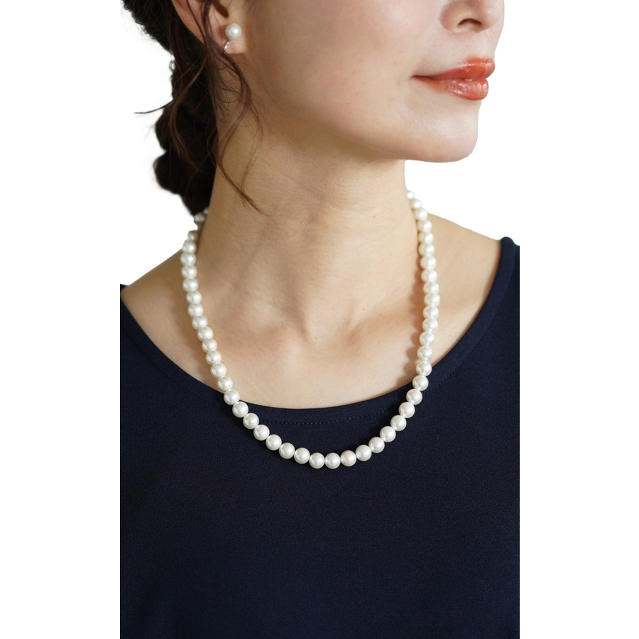 ネックレス、ピアス、イヤリングには8mm貝パールを使用。普段使いにも使える定番のサイズです。特別な日はもちろん、お出かけに、オフィスやデートにと様々なシーンに活躍すること間違いなしの貝パールセットです。