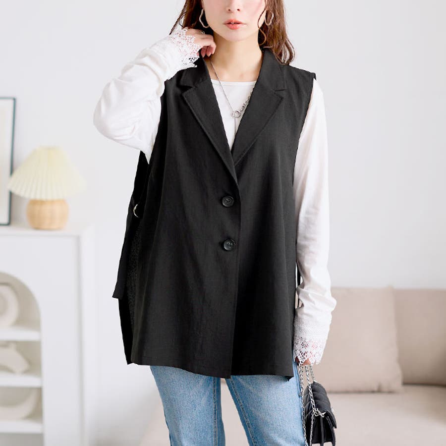 麻調テーラーカラーサイドベルトジレ