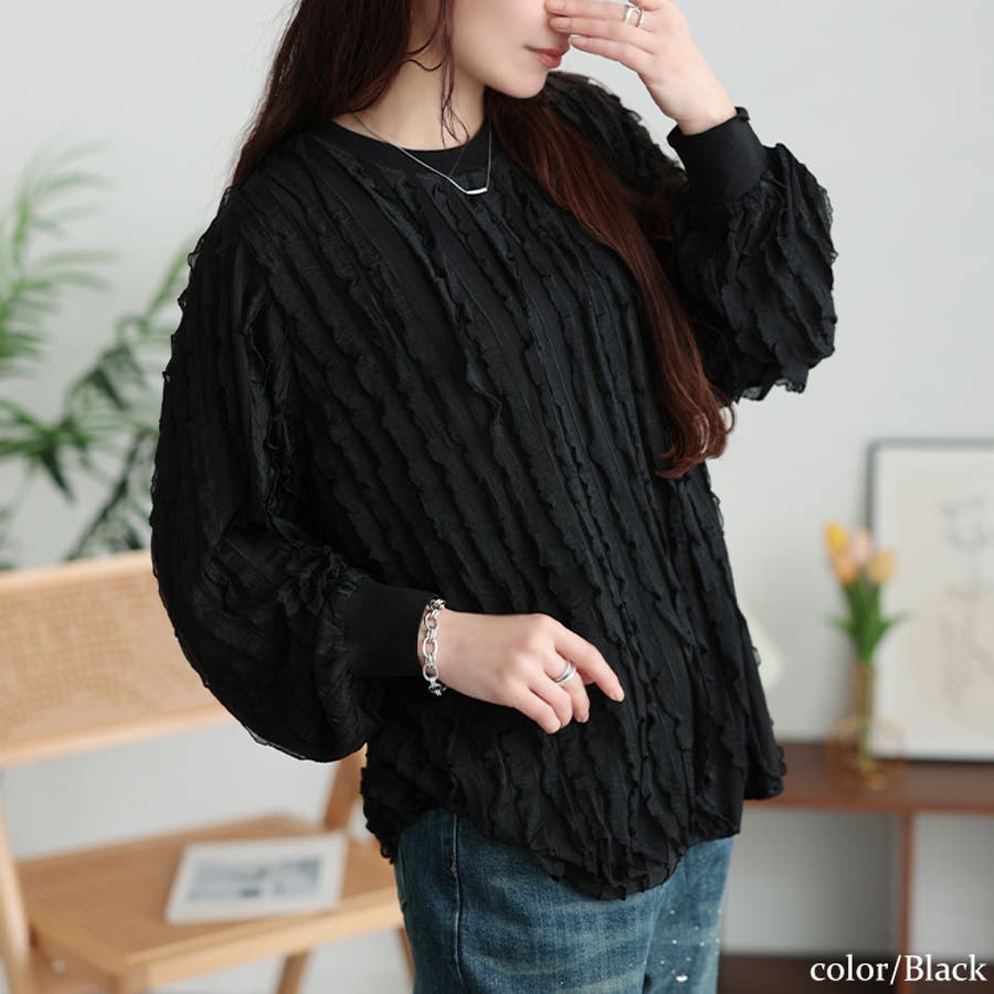 贅沢なフリルが大人レディな佇まいなフリルジャガードプルオーバー。ひらひらと躍るフリルが全面にあしらわれた、大人リッチな雰囲気を纏う一枚。ラフさがありながらも上品に高見えさせ、着こなしやすいプルオーバータイプが嬉しいアイテム。ぽわんと程よくボリューム感のあるスリーブで、女性らしさとカバー力をアップ。