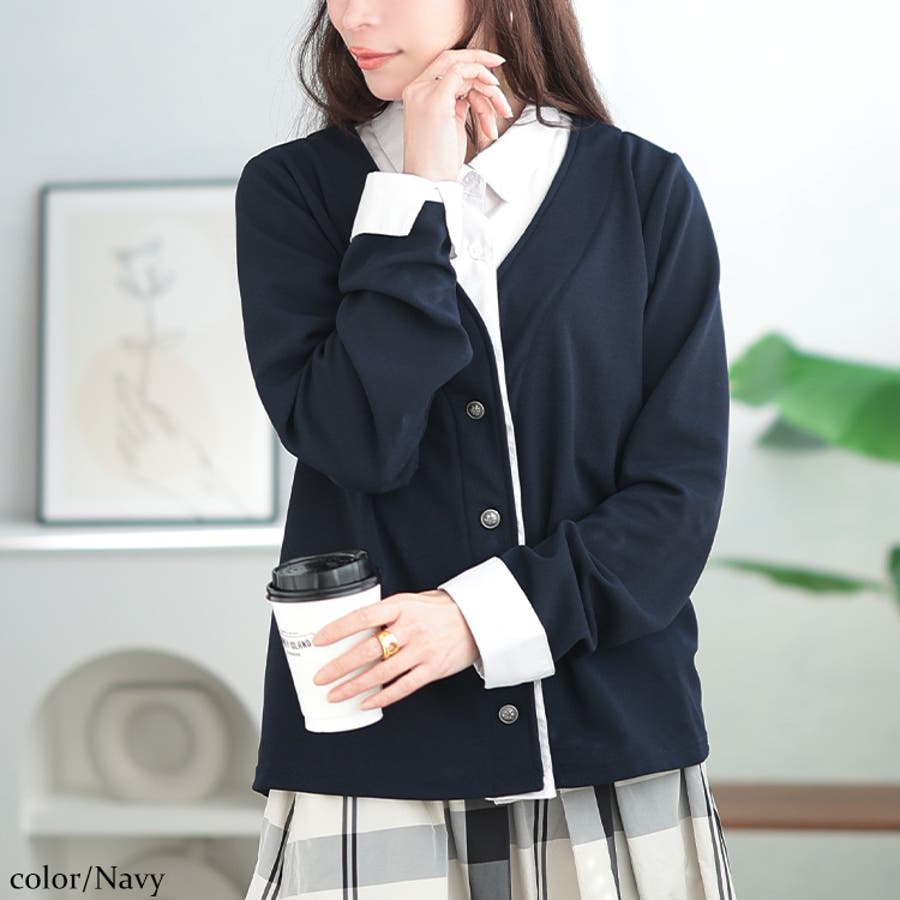 大人ナチュラルな配色デザインの万能アイテム、フェイクレイヤードカーディガンは、オンにもオフにも馴染む鉄板コーデがキマる大人な一枚。ブラウスにカーディガンを羽織ったようなレイヤードデザインで簡単コーデ。フェイクレイヤードだから着膨れ感もゼロ♪アンティーク感のあるボタンや、袖口のスリット入りカフスのデザインがこなれるアクセントに。