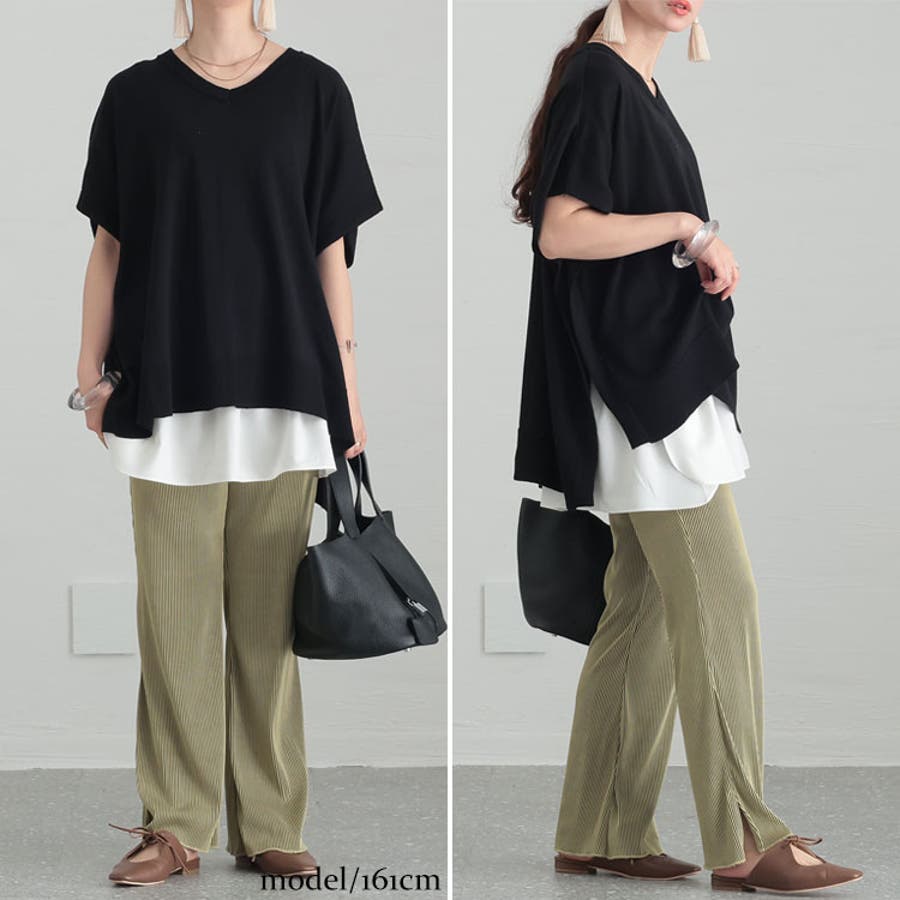 全体的にゆったりと楽に着用していただけますが、スッキリとしたVネックがデコルテを綺麗に見せてくれます。