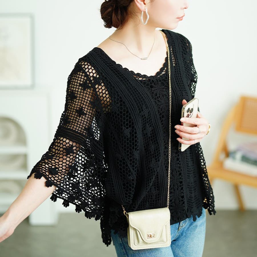 かぎ編みレースで仕立てられたプルオーバートップスは、いつものコーデに重ねるだけで品のある大人なスタイリングに仕上がるアイテム。ざっくり感のあるかぎ編みでヘルシーな肌見せスタイルに。ふわりと広がるフレアなシルエットで女性らしさをアップします。