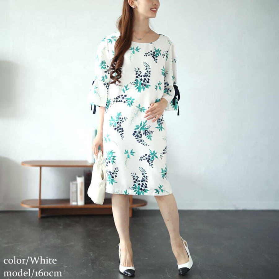 女性らしさ漂い好印象な雰囲気を演出する袖リボンアートフラワーワンピースの登場です。